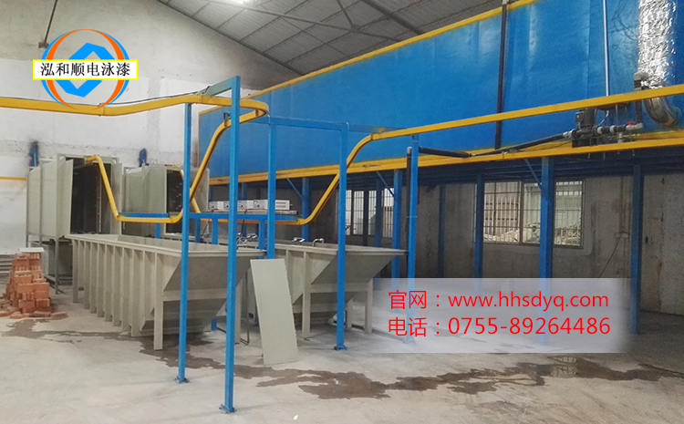 此生產(chǎn)線案例是中山的一家做燈飾電泳加工的廠家,由于是加工廠,所以電泳的顏色是不固定的,因此采用了手動(dòng)和自動(dòng)化結(jié)合的形式。電泳部分采用人工提掛的形式,電泳前處理和后清洗工藝部分則采用軌道線自動(dòng)化流水線形式。兩者相結(jié)合,加快了生產(chǎn)產(chǎn)能的同時(shí),又節(jié)省了人工成本。